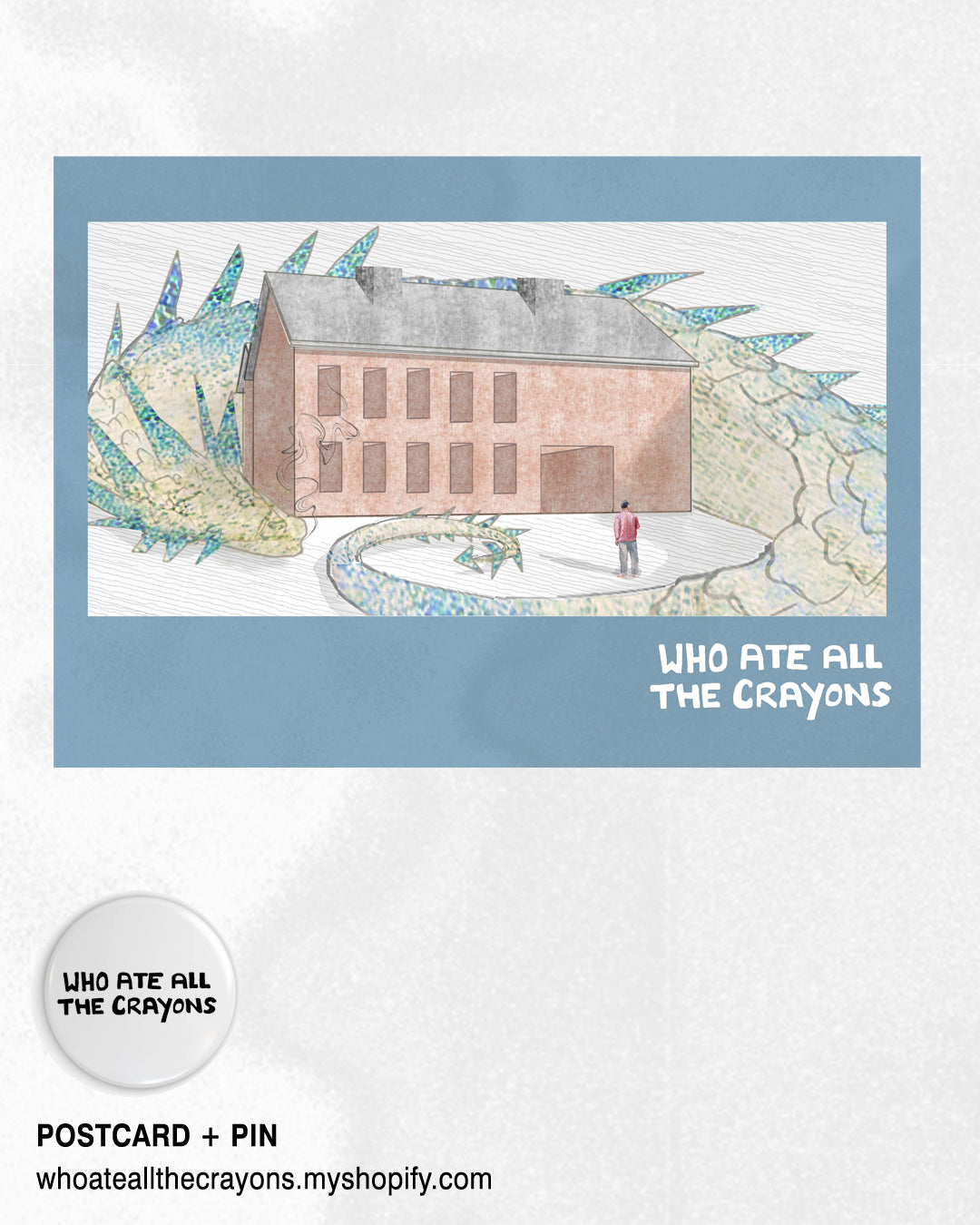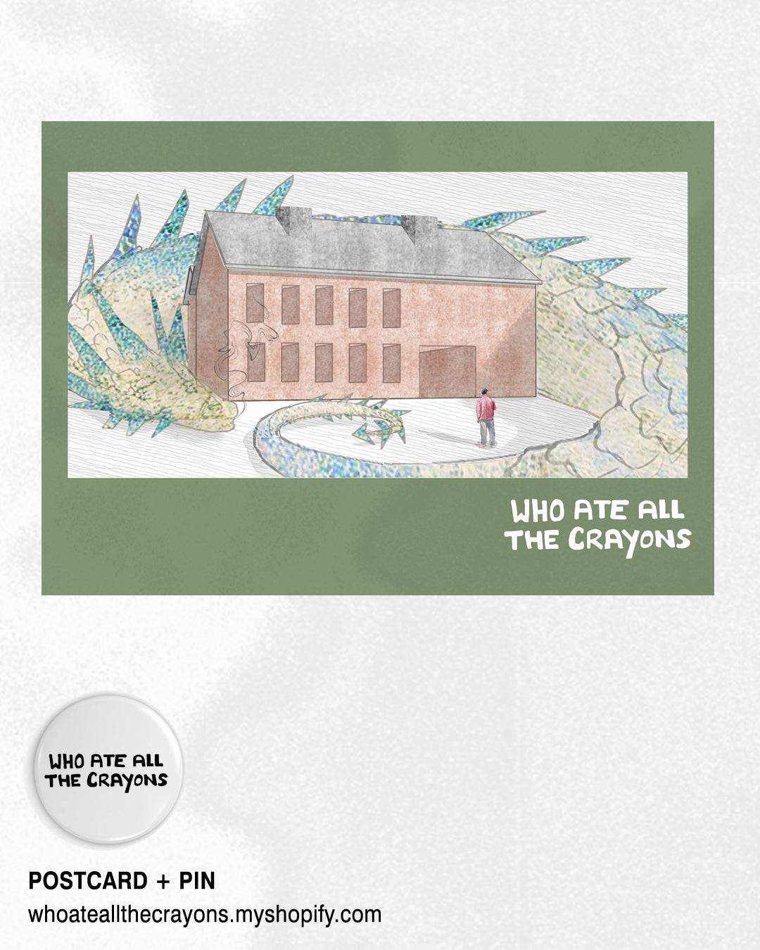 Who Ate All The Crayons postcard with dragon artwork + a WAATC pin
